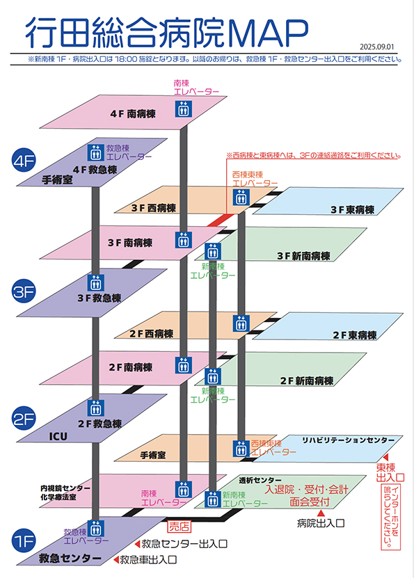 あらかじめご案内した時刻に入院医事課/入院退院受付窓口(新南棟1F)にて入院の手続きをしてください。