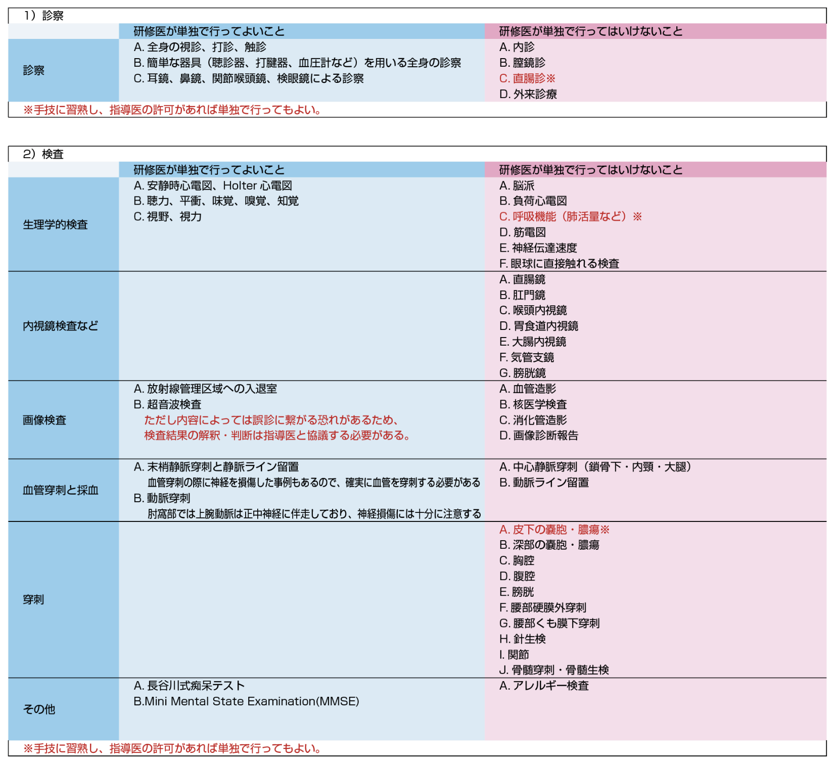 下記の【研修医が単独で行ってはいけないこと】は、薬剤の処方など、事前に指導医の確認を得て行うものと、指導医の立ち会いの下に行うものに大別される。